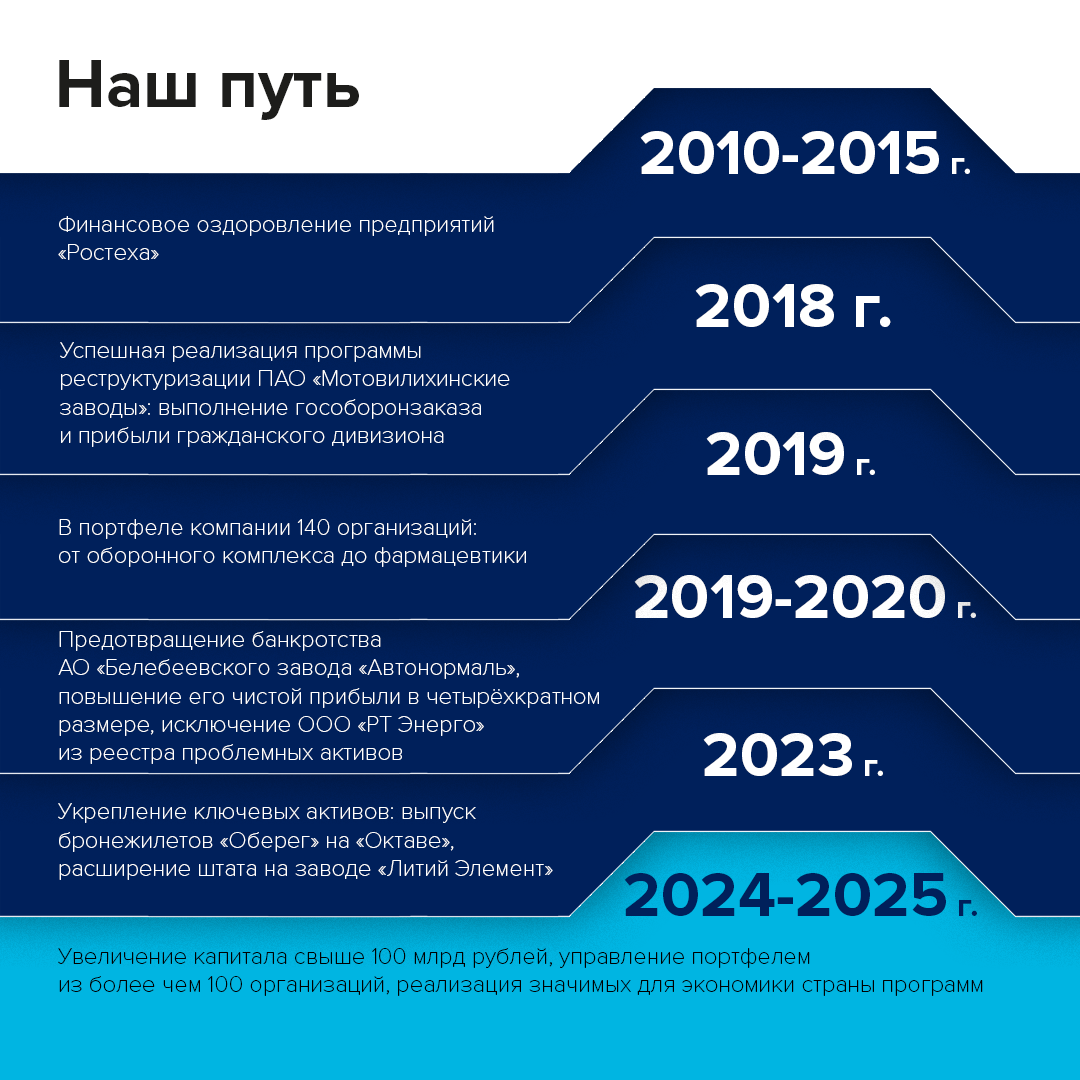 «За 15 лет „РТ Капитал“ прошел путь от компании по работе с долгами до ключевого игрока в системе экономической стабильности ОПК. Наша миссия — не просто стабилизировать предприятия, а создавать условия для их долгосрочного роста. Мы гордимся результатами: от спасения градообразующих заводов до запуска инновационных производств. В будущем фокус останется на повышении конкурентоспособности отечественных предприятий и реализации стратегических проектов, важных для экономики страны», — подчеркнул генеральный директор «РТ Капитал» Денис Ходаковский.
