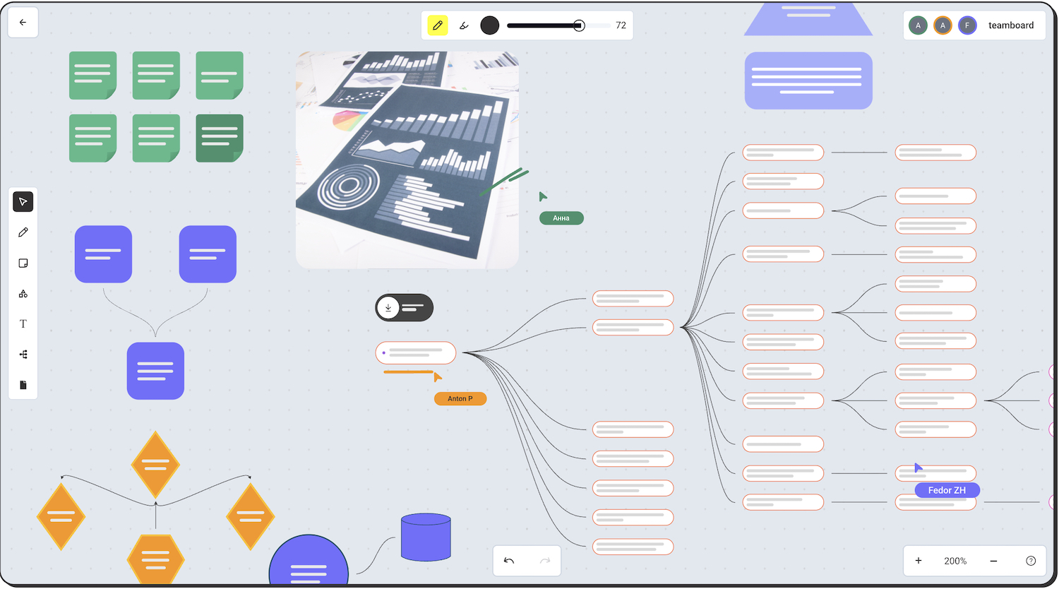 MyBoards предлагает много инструментов для визуализации: можно размещать заметки и стикеры, создавать блок-схемы, интеллект-карты и презентации. С помощью платформы проектные менеджеры и руководители могут отслеживать выполнение задач и координировать процессы. Техническим специалистам платформа поможет визуализировать сложные процессы, дизайнерам — создавать макеты и графические концепции проектов. Преподаватели и студенты могут проводить онлайн-занятия и совместно работать с материалами, просматривать документы и обмениваться файлами прямо на доске.